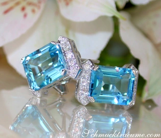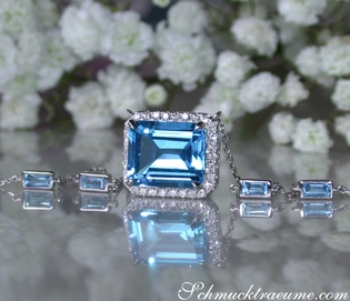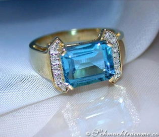 First of all, this opulent ring is dominated by a stately blue emerald-cut topaz in the middle: intense mid-blue (swiss blue) color, no inclusions, accurately cut. Here the blue topaz alone measures 12 mm x 10 mm.
