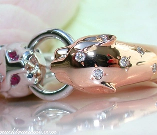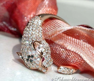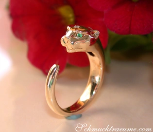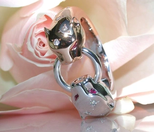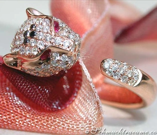 A panther studded with radiant diamonds nestles here most extravagantly and extremely attractively around your finger. The lovingly modelled little head is further accentuated by intensively shimmering rubies and black diamonds. A noble class piece of jewellery for ladies with high demands.