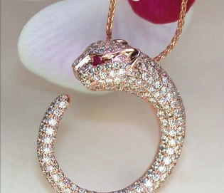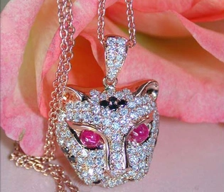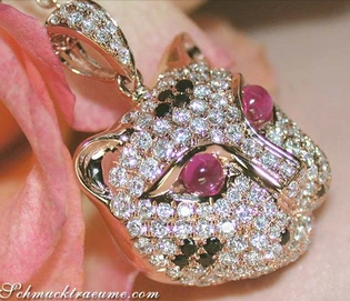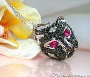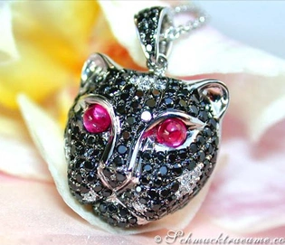 Individual black diamonds are set on the forehead as well as on the sides of the cheeks, while deep red sparkling rubies form the eyes.