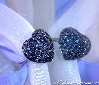Both earrings are set with 53 wonderfully intense sapphires each. The earrings are solidly manufactured. Also the bulbous undersides - also beautifully designed in the heart design - are lined with white gold.