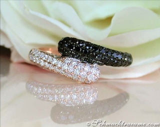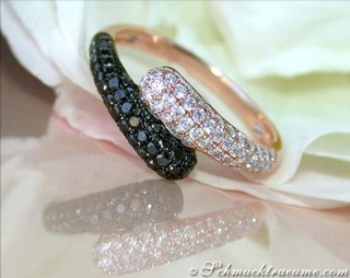 First, the entire ring head consists of two rosegold shanks. One is set with black diamonds, the other one with white brilliant cut diamonds.