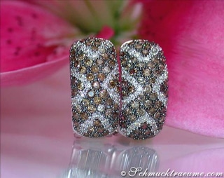 Initially, X-shaped, deep black diamonds are set into the centre of the earrings. This X is framed by sparkling white diamonds. The outer four sides are - in the shape of a triangle - again set with cognac-brown diamonds.