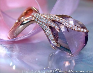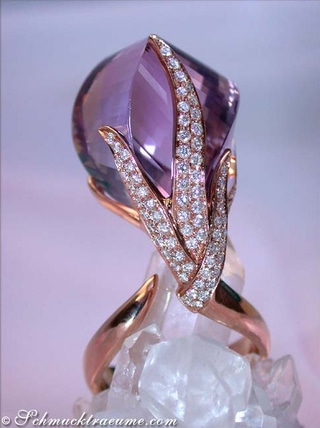 Extravagant shapes meet stately chic: This amethyst ring with brilliant-cut diamonds is especially convincing for women who prefer unusual jewels that will definitely not be found elsewhere.