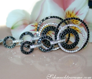 The circles become bigger from above to below. They are set with black and white diamonds which results into a beautiful contrast.