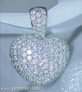 This pendant is completely set with full-cut diamonds on the front. The wide baile, which can be opened at the back to attach the heart to a wider chain or even a pearl necklace, is also completely set with diamonds and is closed at the back with a double safety clasp.