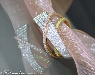 The ring shanks are set in three rows right up to the middle with brilliant cut diamonds.