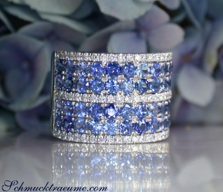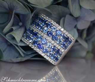 First of all, the ring head is completely set with intensively shining rainbow / multicolor sapphires (yellow, orange, pink, pink, red, blue) and white brilliant-cut diamonds: a total of three rows are set with brilliant-cut diamonds, in between are two rows of colorful sapphires.