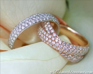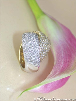 The ring shanks are also completely set with diamonds up to the centre. The very wide ring band features almost the same width all around - it tapers only slightly from the top (9 mm wide) to the bottom (7 mm wide).