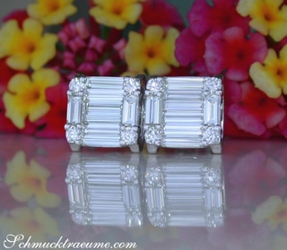 The corners of the diamond square are dominated by four brilliant cut diamonds. On top and on the bottom of the square – inbetween the brilliant cut diamonds - two smaller baguette diamonds each are set seamlessly next to each other as well. When seen from a distance, one might think it wasn’t two baguette diamonds each but rather one big, single baguette diamond.