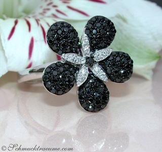 Both clip earrings are designed in a beautiful flower design. First there are five large drop-shaped petals set with deep black shimmering diamonds.
