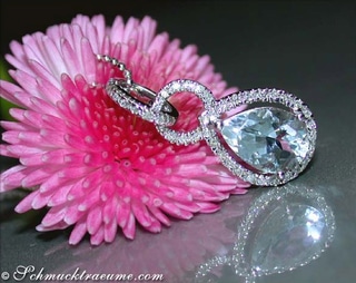 First, two shimmering aquamarines in immaculate pear cut are set in two drop-shaped white gold mountings set with diamonds.