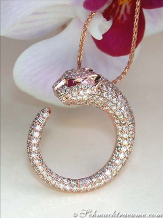 This pendant is modeled after a panther/cat head. The individual details are perfectly modelled and completely set with finest diamonds. On the forehead as well as on the side are further individual black diamonds set, which accentuate the overall picture excellently.