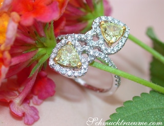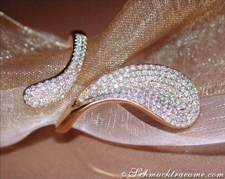 The most attractive feature is that the heart winds smoothly over the finger from the side ring splint, which is set with diamonds far into the central side area. The other side of the ring shank is kept open and ends parallel to the heart.