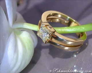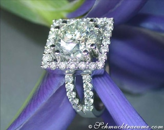 This solitaire is framed by brilliant-cut diamonds: set a little lower, the corners gently rounded. Both ring shanks are also set with diamonds on the sides in the upper third.
