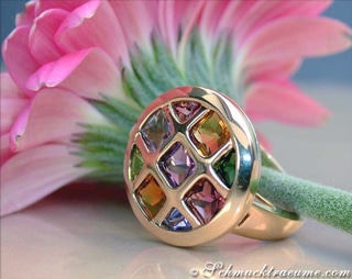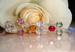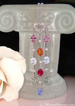 Ein herrliches Farbfeuerwerk: In diesem Anhänger funkeln feinste Edelsteine miteinander um die Wette. Ein ungewöhnliches Design verleiht dem Anhänger zusätzlichen Chic.