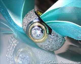 Der mittige Bereich ist nun mit Brillanten ausgefasst. Dabei sind alle Steine im Micropavé-Setting gesetzt. Das heißt: Es sind keinerlei Fassungen vorhanden, die Oberflächen sind wundervoll glatt und ebenmäßig.