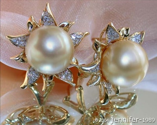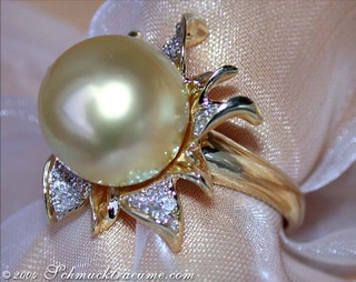 Aus einer vollmassiv gefertigten, apart geschwungenen, mit Brillanten ausgefassten Gelbgold-Fassung (das Design erinnert sehr stark an einen Blütenkelch), ragt als prächtiger Blickfang dieses wundervollen Anhängers eine perfekt gerundete, makellose natürliche Südseeperle, wunderschöne Goldtönung, perfekt rund und herrlicher Lüster/Glanz hervor.