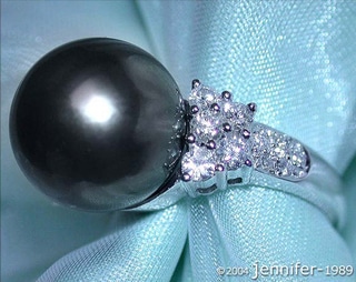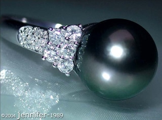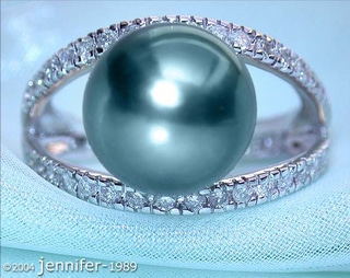 Über den gesamten Ringkopf ziehen sich bis weit in die Mitte der Ringschiene hinein zwei mit Brillanten ausgefasste Gelbgoldschienen. In der Mitte dieser beiden Schienen sitzt eine große Tahitiperle - perfekt gerundet, vollkommen makellos, seidig glatte Haut, feinster Lüster, anthrazit-silber schimmernd.