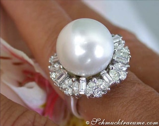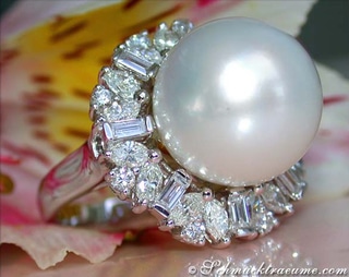 Umrandet wird diese große Perle von 36 Brillanten / Diamanten, die abgestuft im Brillant- und Baguette-Schliff angeordnet sind. Gerade diese beiden unterschiedlichen Schliffarten wirken äußerst apart und betonen die mittige Perle hervorragend.