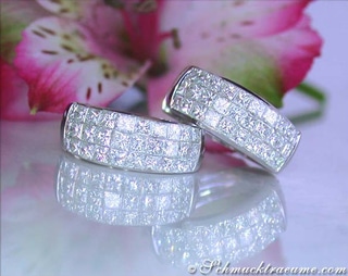 All 14 diamonds are set together almost invisibly. There are no prongs whatsoever holding the stones, the surfaces are completely smooth and even (= invisible setting).