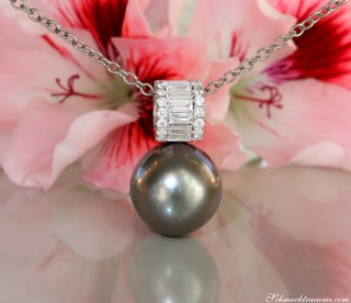 Fest verbunden ist die Perle mit einem Diamanten Rondell, das selbst für breitere Ketten oder Halsreifen Platz lässt. Besetzt ist das Rondell mittig mit völlig ebenmäßig gefassten Diamanten im Baguette Schliff, die wiederum seitlich von Brillanten flankiert werden. Klare Linien, die für ein elegantes Erscheinungsbild und eleganten Glanz sorgen.
