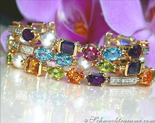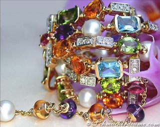 In the front central area, five long yellow gold rows are now made, fully movable, these in turn are lined with wonderfully colourful and transparent amethysts, citrines, blue topazes, iolites, peridots, pink tourmalines, green tourmalines, white flawless frehswater pearls and diamonds in channel setting.