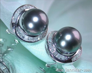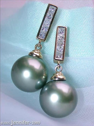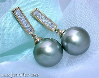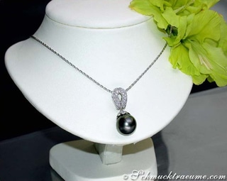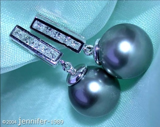 First, two big, completely flawless, perfectly rounded and anthracite/silver shimmering tahitian pearls are set below the diamond mountings. These mountings are crafted in the shape of a double strap and set with diamonds.