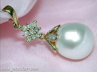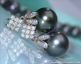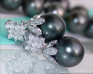 Two very large southsea pearls (perfectly rounded, silky smooth skin and high gloss luster) are set into a pretty diamond settings.