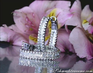 These hoops are set with brilliant cut diamonds on the sides. In the middle are now baguette-cut diamonds - absolutely even, finest cut, excellent color and clarity.