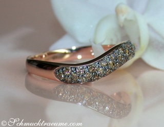 The entire ring head of this extra wide ring is set with 183 natural brown diamonds of outstanding SI/VS quality right into the side ring shanks. All brilliant-cut diamonds are set absolutely evenly without visible prongs, the surface is therefore completely smooth.
