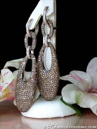 First, two white gold hoops (set with brilliant cut diamonds) are linked to two white gold diamond ovals. Following downwards, two stately, extra long oval / teardrop-shaped mountings are attached. These are completely set with deep black shimmering diamonds.