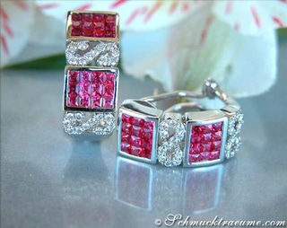 Along the entire length of both earrings, 48 strong midnight blue shimmering princess cut sapphires and 48 brilliant cut diamonds are set alternatingly.