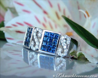 The sapphires are set closely together in the so-called invisible setting. Therefore no prongs are present.