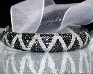 The pendant is completely paved with black diamonds as well as white diamonds in a distinctive zigzag design.