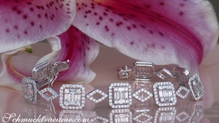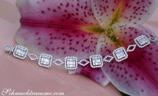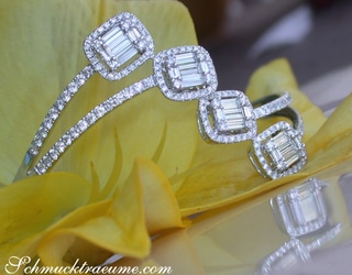 First, the front of the bangle is covered by two rows that are set with diamond squares. Hereby, these squares are crafted in a sophisticated way: First, two baguette cut diamonds are set next to each other in the middle. These two diamonds are surrounded by four further baguette cut diamonds each. Single brilliant cut diamonds (so 4 per square) are set in the corners of these squares.