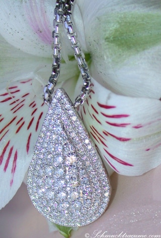 An elegant white gold anchot chain has a large pear-shaped pendant at the bottom (completely set with 123 diamonds on the outside).