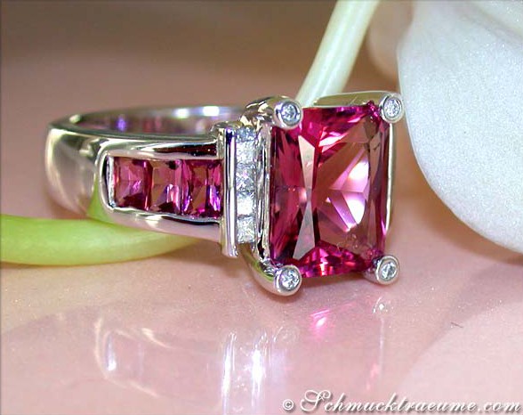 First, a radiant emerald-cut Pink Tourmaline is set into the centre of the ring head. This impresses above all with its intense color brilliance and outstanding transparency.