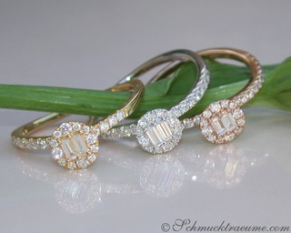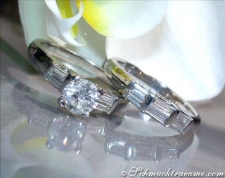 First, every single ring head is dominated by a baguette cut diamond that is surrounded by brilliant cut diamonds. The ring shanks are set with brilliant cut diamonds up until the middle as well.