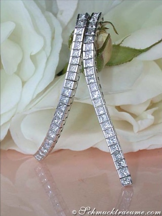 Over the entire length of the earrings, three rhombic shaped squares follow each other and are invisibly set with 86 princess cut diamonds.This means that no prongs are visible, the surfaces are completely smooth and even.