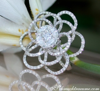 A wonderful diamond blossom is set directly above the crossing rows: a diamond in the middle, framed by 5 large pear-cut diamonds.