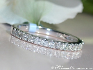 First, the front side of this half eternity band is set with 18 brilliant cut diamonds. The stones reach well into the middle of the ring shank.