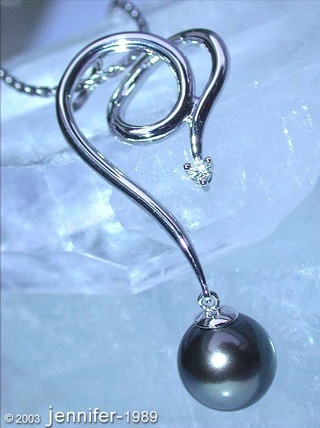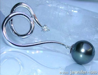 On a perfectly flawless Tahitian pearl, perfectly rounded with silky smooth skin and glossy luster, a curved rail runs upwards.