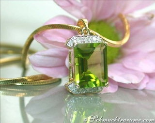 This peridot is bordered at the top and bottom by five smaller diamonds each. The eyelet leaves room for 2-3 mm thick chains.