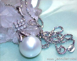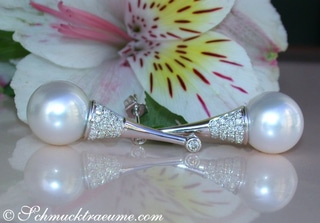 It is connected with a whitegold tenpin setting that is set with diamond on its bottom. Now, a beautiful southsea pearl follows – totally flawless, amazingly shimmering luster, perfectly rounded, silver white color.
