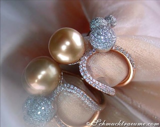 First of all, two gently curved, solid yelow gold rails run over the entire ring head, which are completely paved with diamonds. On top - or rather, depending on which side you look at the ring from - a shimmering white South Sea pearl is enthroned: completely flawless, perfectly rounded, silky smooth skin and the finest high-gloss luster.
