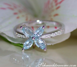 Zunächst besteht die Ohrstecker aus jeweils vier Aquamarinen im Marquise Schliff, die von Krappen gehalten werden und so aneinandergesetzt sind, dass sie einer Blüte oder einem Stern ähneln. Ein sehr feminines Design.