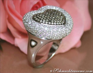 This central pearl is now entwined by a white gold track, which is lined with white diamonds and elegantly curved at the sides into the fully solid ring band. Parallel to this, another rail is set, which - extremely rich in contrast and extravagant - is set with wonderfully clear cognac-brown diamonds and also merges into the ring shank on the other side.