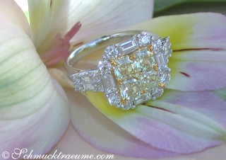 First, twelve finest canary yellow diamonds are set in the middle of the stately ring head (17 mm x 16 mm). These are - color-coordinated - set in Yellow Gold prongs.