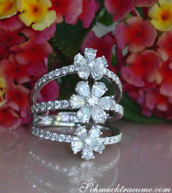 First, the ring head is dominated by three diamond blossoms that are made absolutely accurate. One brilliant cut diamond each builds the center. It is surrounded by pear shaped diamonds that are cut in exactly the same size. The center blossom is a bit bigger, the two other ones have exactly the same size.
