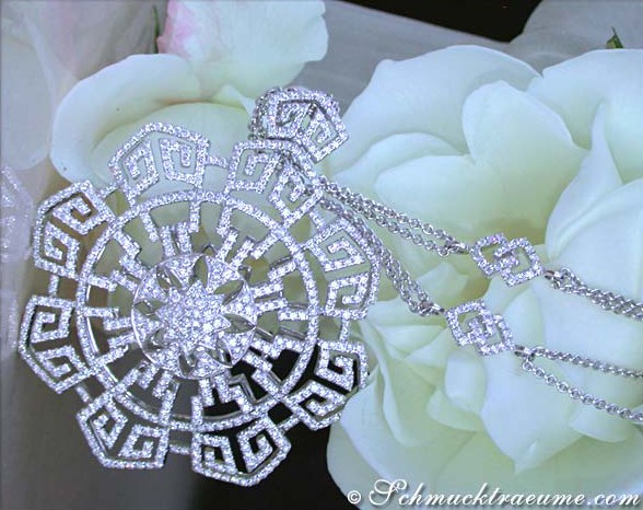 A huge pendant in a highly elaborate and wonderful design is attached to a double white gold anchor chain. It is completely paved with diamonds.